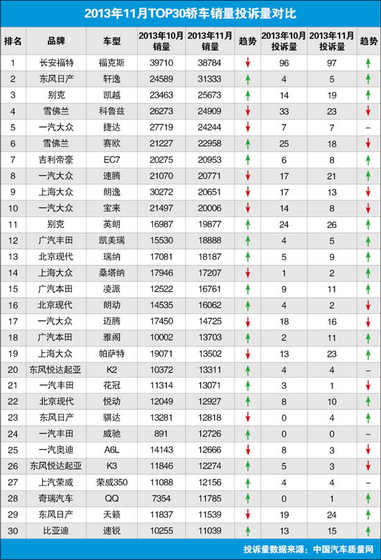 2013年11月TOP30轎車銷量投訴量對應(yīng)點評
