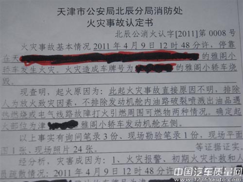 在眾多汽車(chē)自燃的案例中,又加入了新雅閣的身影。來(lái)自天津的郭先生6月份向中國(guó)汽車(chē)質(zhì)量網(wǎng)投訴,他去年11月購(gòu)買(mǎi)的廣汽本田第8代雅閣于2011年4月9日剛做完首保400公里后??柯愤厱r(shí)自燃。5月30日,當(dāng)?shù)叵啦块T(mén)向郭先生出具了《火災(zāi)事故認(rèn)定書(shū)》:此火災(zāi)事...