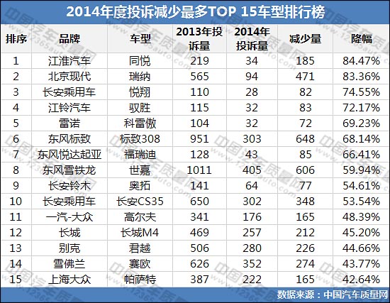 2014年度投訴減少最多TOP15車型排行榜