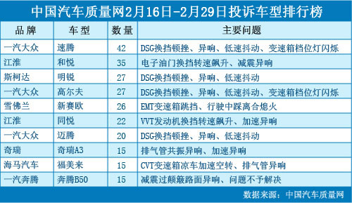在本時間段內(nèi)(2012年2月16日~29日),中國汽車質(zhì)量網(wǎng)(m.oa021.com.cn)接到消費者針對汽車產(chǎn)品的投訴562宗,共涉及127款車型,與2月上半月相比投訴量有所提高。 大眾系列DSG問題投訴凸顯 近日,在中國汽車質(zhì)量網(wǎng)投訴中,2月下半月出現(xiàn)關(guān)于DSG變速...
