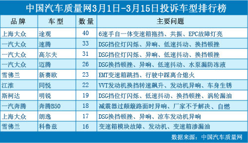 中國汽車質(zhì)量網(wǎng)2012年3月上半月投訴排行