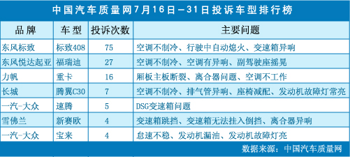 中國汽車質(zhì)量網(wǎng)7月下半月投訴車型排行榜