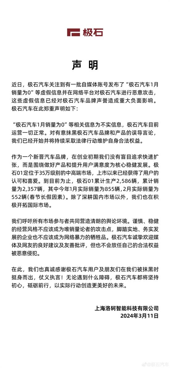 對有意抹黑極石汽車品牌和產(chǎn)品的誤導(dǎo)言論,官方已經(jīng)開始并將持續(xù)采取法律行動(dòng)維護(hù)自身合法權(quán)益。