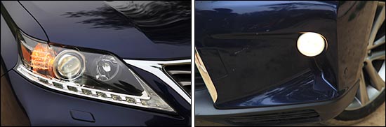 新一代雷克薩斯RX450h的前臉,依舊延續(xù)了最新的家族式設(shè)計(jì)風(fēng)格。專(zhuān)屬的藍(lán)色象征混動(dòng)身份的logo,搭配采用大量金屬鍍鉻材質(zhì)鑲嵌的,全新紡錘形進(jìn)氣格柵,使其遠(yuǎn)遠(yuǎn)望去極具品牌辨識(shí)度。而經(jīng)過(guò)重新優(yōu)化的前大燈組,在增加犀利的“L”形日間行車(chē)燈的同時(shí),更融入了高強(qiáng)度HID氙氣大燈,以及自適應(yīng)照明系統(tǒng)AFS。配合相對(duì)低矮的車(chē)身及左右兩側(cè)造型獨(dú)特的霧燈,使得新一代雷克薩斯RX450h的前臉,增添了些許動(dòng)感時(shí)尚的韻味。