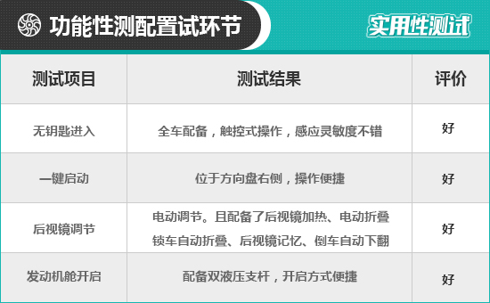 后視鏡調(diào)節(jié)采用了按鍵設(shè)計(jì),按鍵位于車窗按鍵前方。調(diào)節(jié)后視鏡時(shí),直接按下對(duì)應(yīng)位置圖標(biāo),通過(guò)按鍵指示方向進(jìn)行上下、左右調(diào)節(jié)即可。測(cè)試時(shí),外后視鏡全程沒(méi)有出現(xiàn)卡頓的現(xiàn)象。在功能上,該車后視鏡還支持鎖車自動(dòng)折疊、倒車自動(dòng)下翻、電動(dòng)折疊/調(diào)節(jié)、記憶以及加熱等。